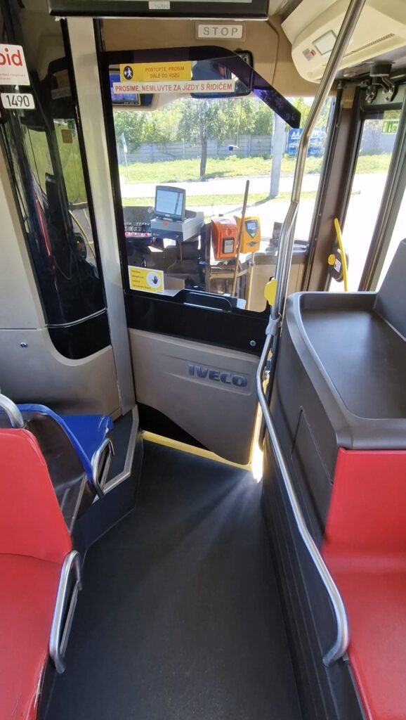 Jako další věcí na řadě je zapnutí strojku, bez kterého nevyjedu. Právě ten mi ukazuje jízdní řád, ovládá panely, hlásí zastávky apod. Tady nastává hledání toho správného tlačítka – Urbanwayem jsem nikdy předtím nejel a i jako cestující jsem s ním cestoval párkrát. Od kolegy jsem zjistil jen to, kde se nastavuje volant a otevírají dveře zvenku, zhlédnul jsem pár instruktážních videí na YouTube, ale nic víc jsem o tom netušil. Musím se tedy opřít o své znalosti, anebo jít po tlačítkách stylem pokus / omyl.